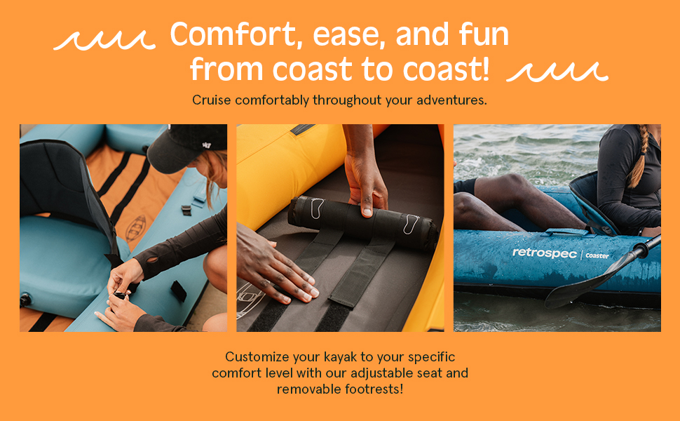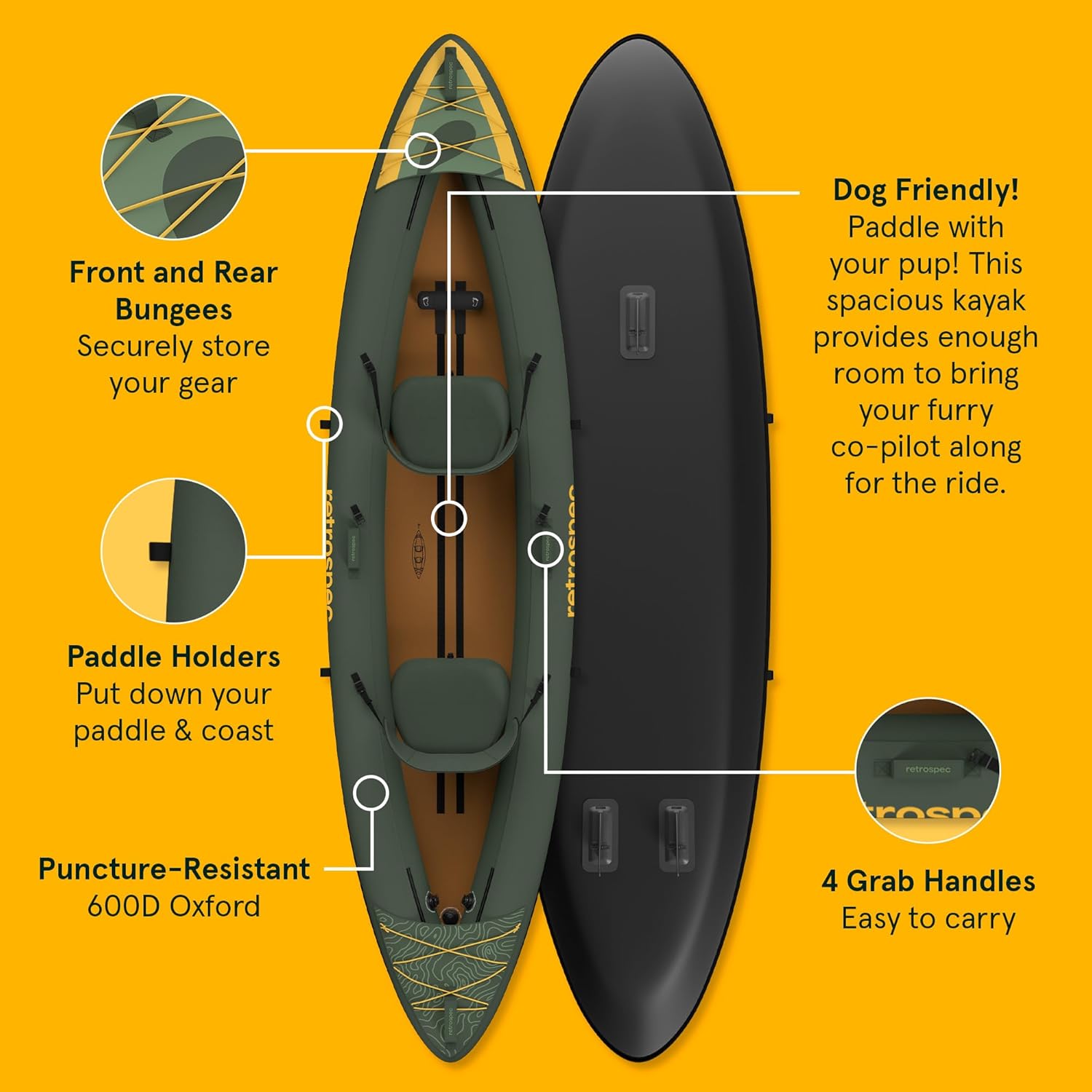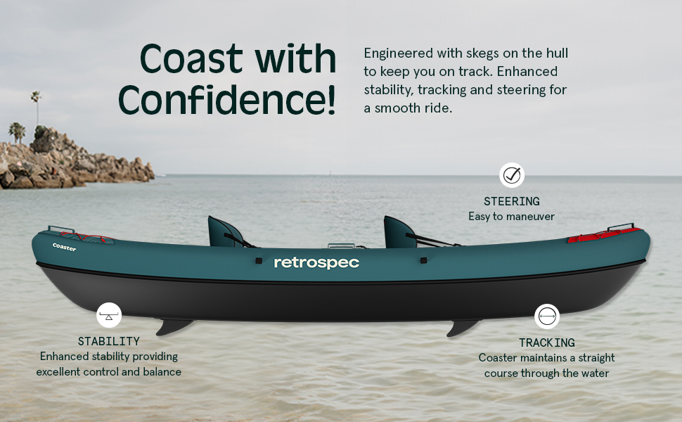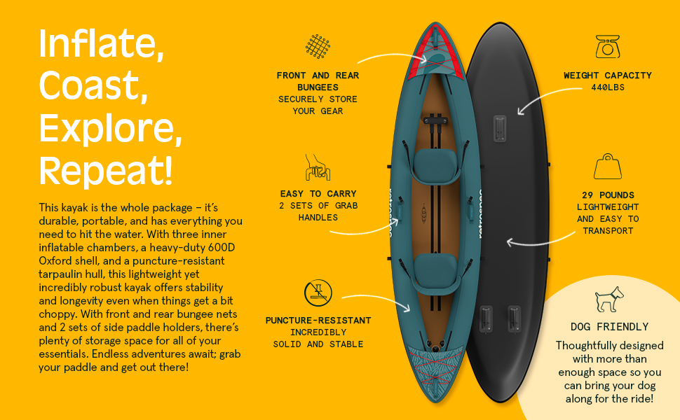 - INFLATABLE 2-PERSON KAYAK -The Coaster inflatable tandem kayak is designed for two riders and even an adventurous pup! This dog-friendly Kayak allows your furry companion to join in on the fun. It is incredibly stable, spacious, and comfortable, ensuring a smooth, enjoyable ride for all onboard. Just like with any water activity, it’s essential for all riders to wear a properly fitted USCG approved personal floatation device when kayaking, and don’t forget one for your furry friend too!