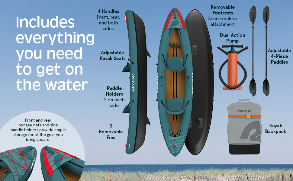 - WHAT’S INCLUDED – This ultimate go-with-the-flow inflatable kayak for adults includes a dual-action pump, paddles, removable fins, footrest and carry bag—everything you need to get out on the water!